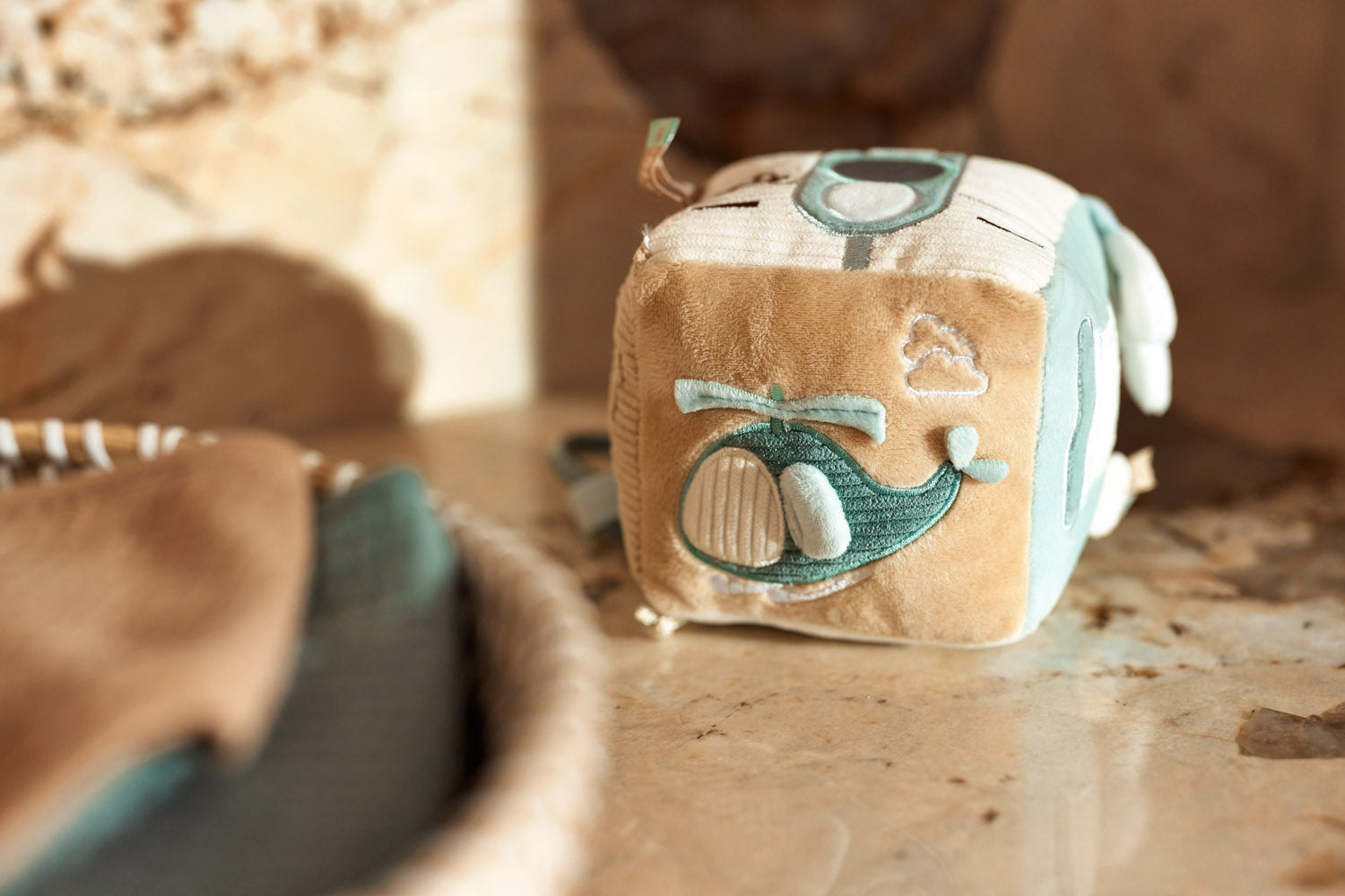 This adventurous activity cube in the ‘On The Go’ theme is perfect for curious little ones! In the lovely colours Sea Green and Biscuit, this cube offers a world of discoveries. You will find an adorable key with a crunching sound, a gas pump print and a traffic light with a mirror for your little one to marvel at. In addition, there are many more fun elements to play with! This activity cube stimulates the senses and provides endless playtime fun!