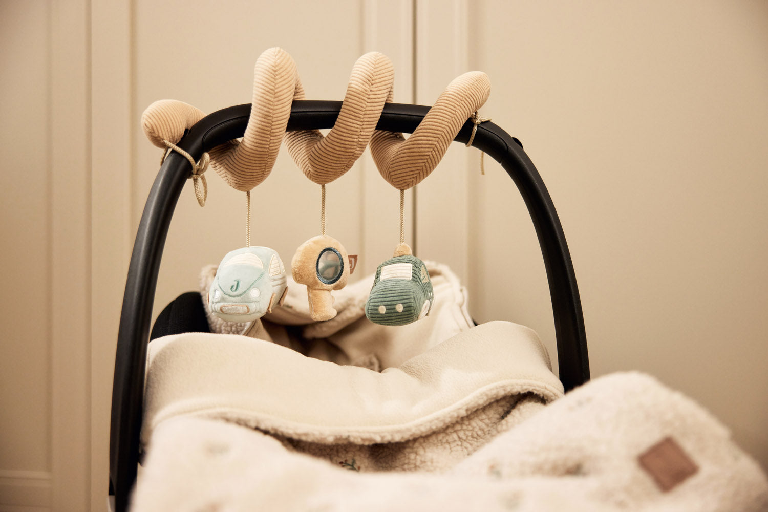 This colourful activity spiral is perfect for your little one and provides endless playtime fun! With two fun cars, a handy key, and a combination of rib fabric in Biscuit, Cloud Blue and Sea Green, this spiral is not only fun to look at, but also to play with. The spiral has a mirror, a bell and crackle to stimulate your baby's senses. Thanks to the attachment loops on both sides, you can easily attach the spiral to the playpen or Maxi Cosi product. So cute!