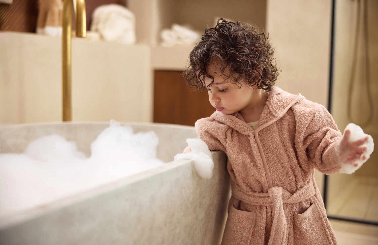A terry bathrobe is always a practical item to have for your toddler. The bathrobe is perfect for after a bath, a shower or swimming. The soft terry cloth easily absorbs moisture and keeps your little one warm. The cheerful hood with ears will dry the hair. The bathrobe is also practical to take with you on holiday or to a sleepover. The bathrobe can be closed with a press stud, elastic in the back part ensures a perfect fit and the cord is attached to the bathrobe, so that you'll never lose it. The bathrobe is available in the colours: Sea Green, Ash Green, Biscuit, Caramel, Ivory, Jeans Blue, Nougat, Wild Rose, Pale Pink and Biscuit. Make sure to check out our striped bathrobes as well!
