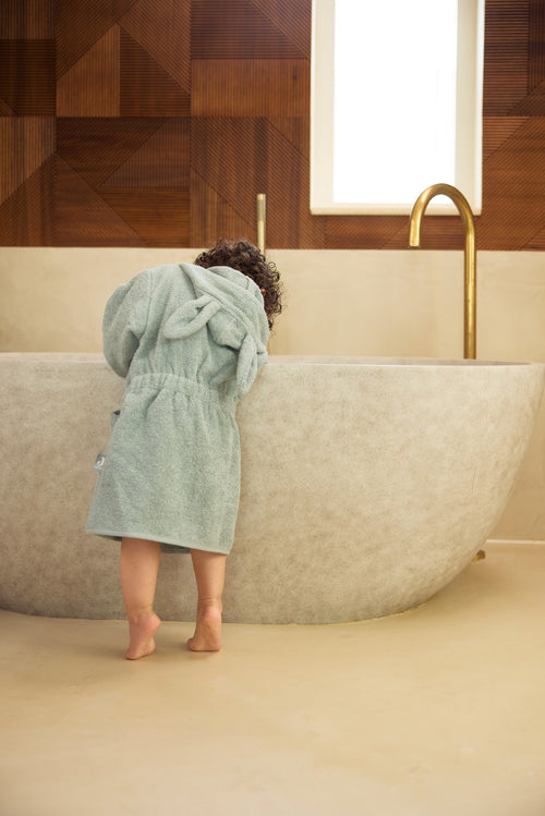 A terry bathrobe is always a practical item to have for your toddler. The bathrobe is perfect for after a bath, a shower or swimming. The soft terry cloth easily absorbs moisture and keeps your little one warm. The cheerful hood with ears will dry the hair. The bathrobe is also practical to take with you on holiday or to a sleepover. The bathrobe can be closed with a press stud, elastic in the back part ensures a perfect fit and the cord is attached to the bathrobe, so that you'll never lose it. The bathrobe is available in the colours: Sea Green, Ash Green, Biscuit, Caramel, Ivory, Jeans Blue, Nougat, Wild Rose, Pale Pink and Biscuit. Make sure to check out our striped bathrobes as well!