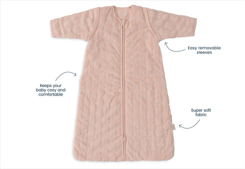 Looking for the ultimate sleeping experience for your little one? All our sleeping bags are made of wonderfully soft and breathable material and feature the trendiest prints, specially designed by our design team, so your little one can always sleep in style, whatever the season. All sleeping bags also feature a secure and comfortable zipper to make putting on and taking off as easy as possible. So from newborn minis to naughty toddlers and from balmy summers to cold winters, we'll make sure your child sleeps well! This wonderful baby sleeping bad has detachable sleeves. This is how you transform it from a TOG value of 3.5 for cold winter days to a TOG value of 2.5 for chilly nights in spring and autumn. Buy this sleeping bag in different colours and in 70, 90 and 110 cm! So you're guaranteed to find the perfect fit for your little one. Is the sleeping bag not yet warm enough? You can combine this sleeping bag with one of the lovely blankets from Jollein.