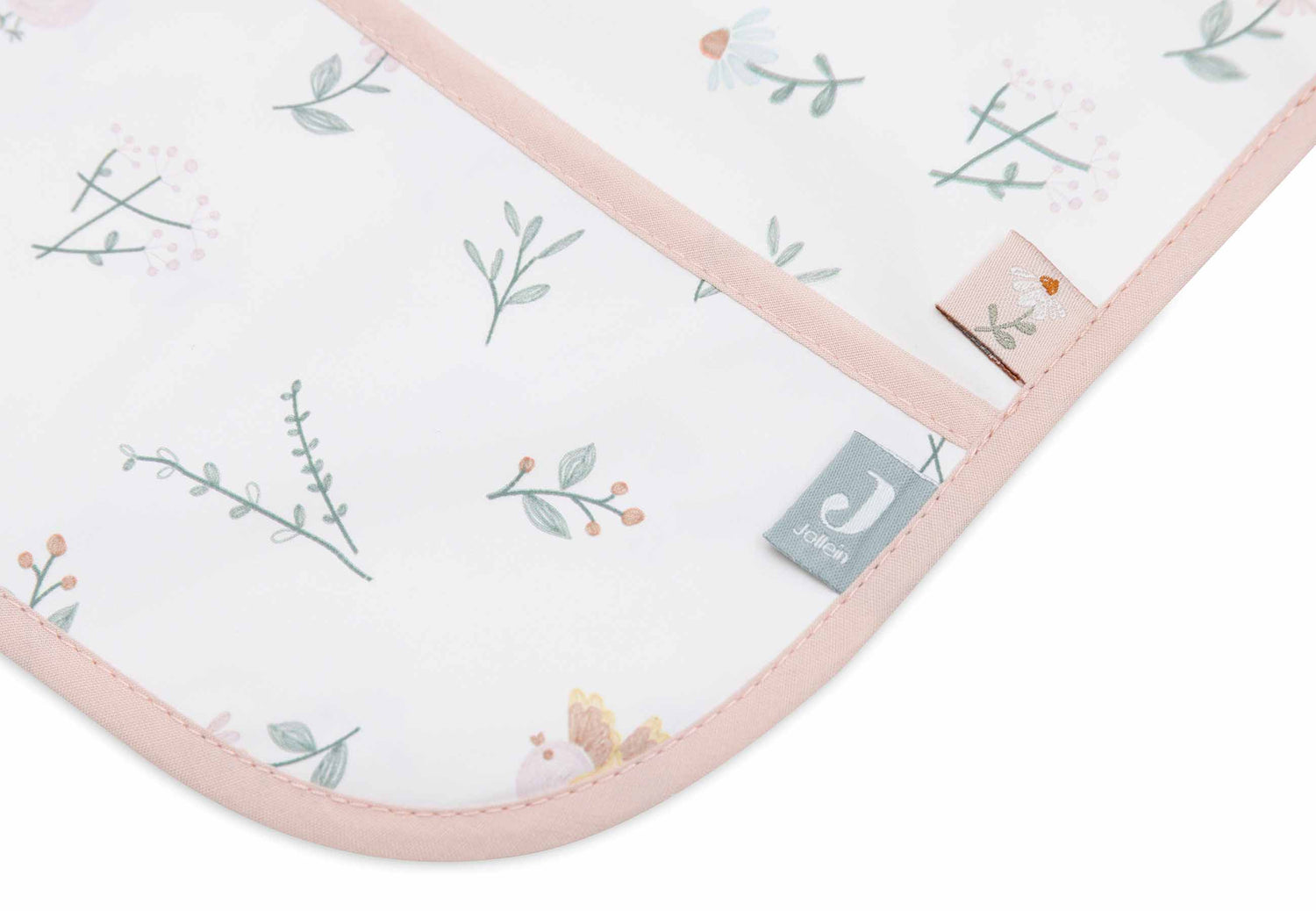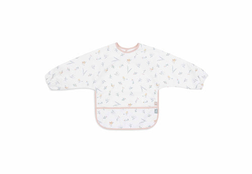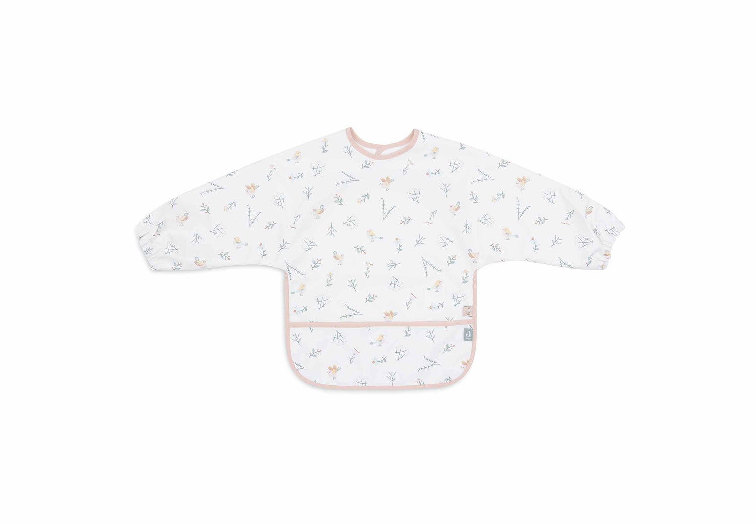 This bib with sleeves is great! This cute little apron protects your baby or toddler's clothes very well, thanks to the practical sleeves. Ever wondered why there is a double layer of fabric at the bottom? This was intentional! During independent eating, food regularly drips down the chin over the bib, but the bottom edge of the bib catches this as a practical collection tray. You’ll definitely appreciate it! Not only practical during meals, but also for crafts and finger painting. In our adorable Lovely Birds theme, this bib is even cuter, decorated with twigs and birds, and even has an extra emblem with a flower on it.