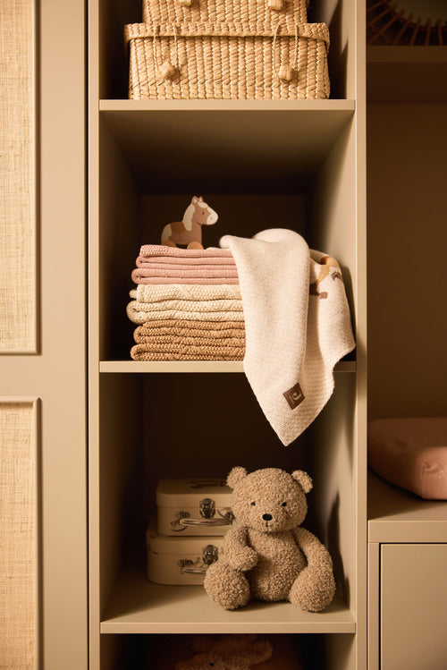 This lovely Cosy Knit knitted blanket made of cotton will certainly keep your little one warm! Idea for use in a cot. The blanket can be combined well with one of our sheets. This not only looks great, it also means that you don't have to change the blanket every time. This nice knitted blanket with Cosy Knit pattern keeps your little one nice and warm and is wonderfully soft because of the teddy fleece inside. Will you pick the colour Ivory, Wild Rose or Sea Green?