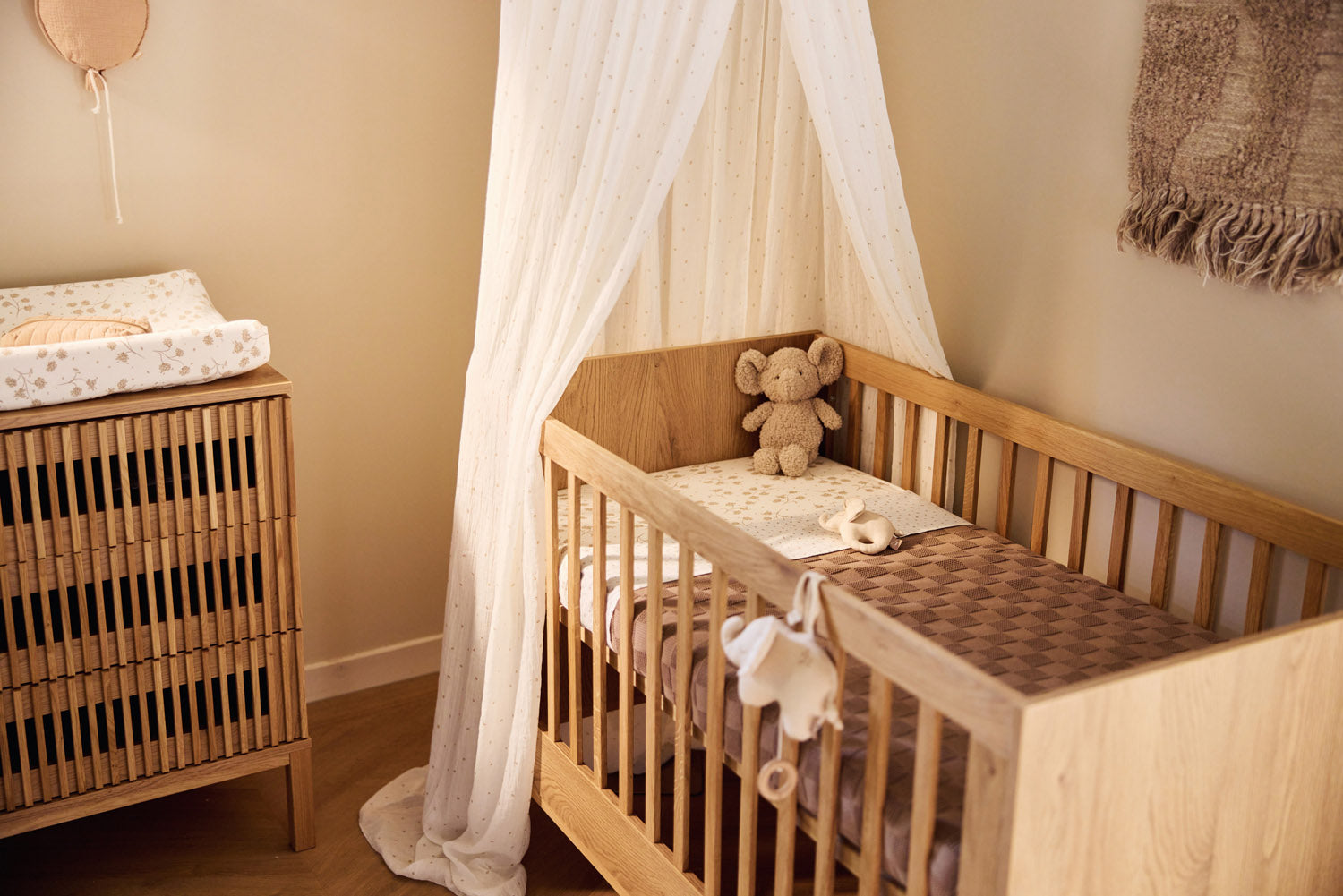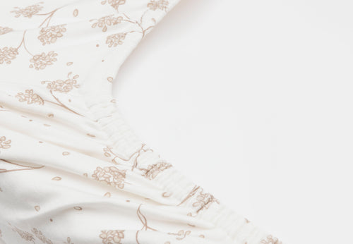 This changing mat cover brings a calming and natural atmosphere to the nursery. Made from wonderfully soft and stretchy jersey fabric, it features a subtle all-over print of elegant leaves. Thanks to the elastic edges, the cover stays securely on the changing mat, allowing your little one to lie comfortably during diaper changes. This cover is perfect to pair with our Ruffle sheet!