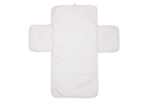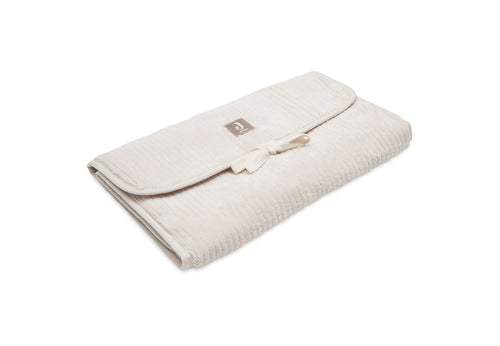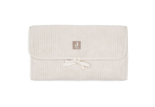This changing mat has a soft ribbed outer fabric. The removable interior features a cute leaf print and is made from high-quality polyester. It includes practical storage pockets for diapers and other essentials, and closes easily with a bow. Perfect for on-the-go!