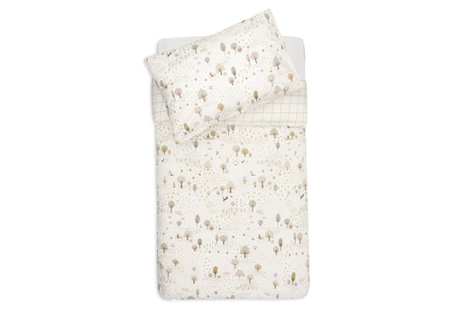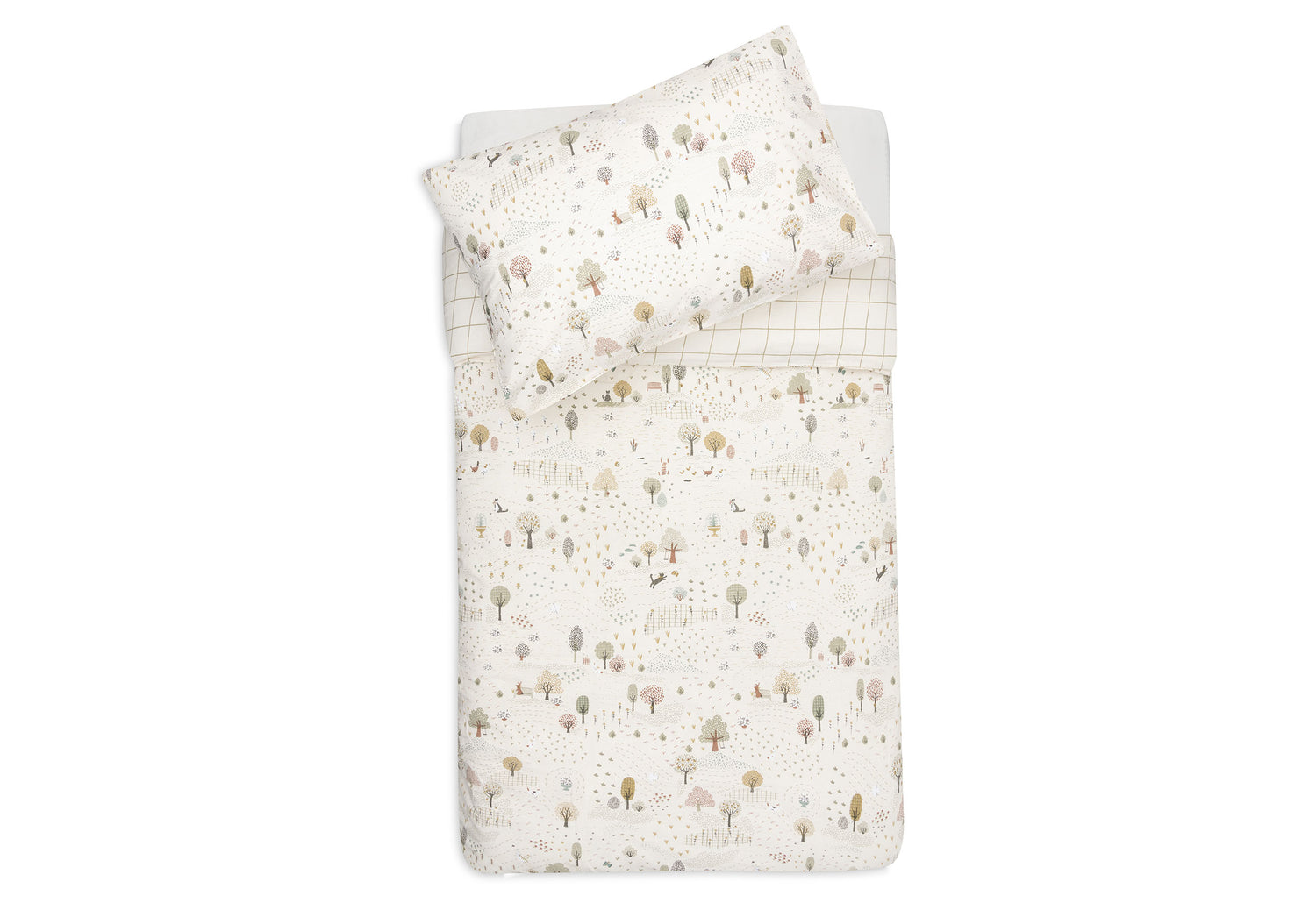 Add coziness to the kids' room with this cute duvet cover. The top side has a cheerful all-over print, while the back features a nice check pattern in oatmeal and dark olive green. The best part? It’s reversible! The pillowcase also has two fun prints, so you can flip it as you like. Available in 100x140 cm – ideal for toddler or crib beds.