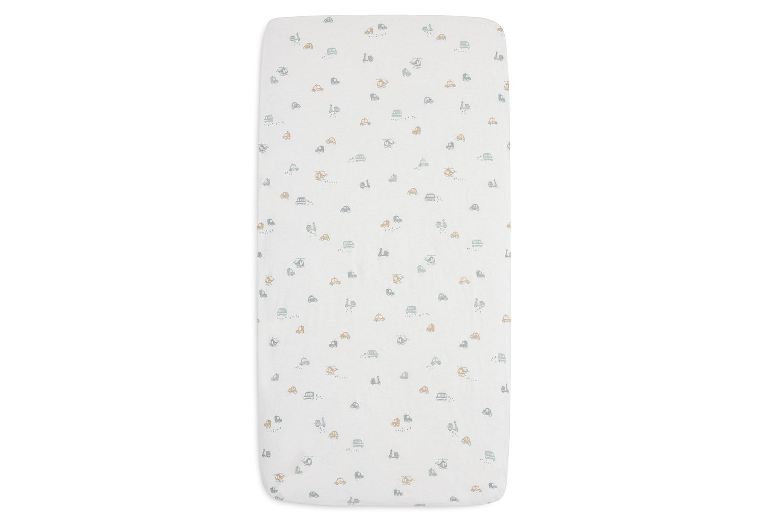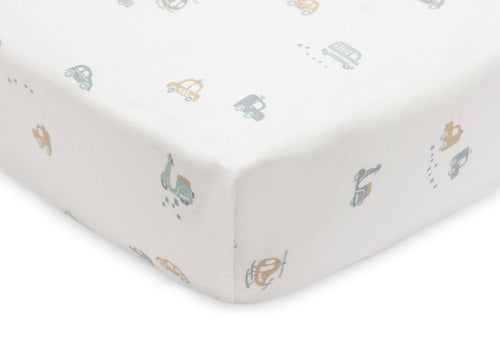 Keep your little one's mattress safe and comfortable with this cute fitted sheet. This fitted sheet has a cute all-over print with cars, scooters and helicopters on an Ivory-coloured background. The fitted sheet closes effortlessly around the mattress thanks to the elastic bands in each corner. Mix and match this fitted sheet perfectly with our fine blankets from our new collection such as the Cosy Knit in Ivory or the Check Knit in Biscuit.