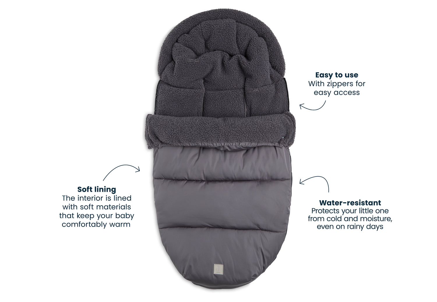 Keep your little one warm with Jollein's footmuff for the buggy/stroller. A real must-have for cold winter days. This footmuff has openings for a 3 and 5 point belt, perfect for the belts of the buggy or stroller. You can open the footmuff with the zipper, which moves both ways, so you can easily put your baby in and take them out again. The back of the footmuff has a practical hood, which you can fold around the head support of the buggy. This way, the footmuff will stay properly in place. The footmuff is waterproof, so your baby will be warm and dry! Which colour will you get? This footmuff does not have a TOG rating, as it is designed to keep your little one warm on the go and not to be used as a sleeping bag.