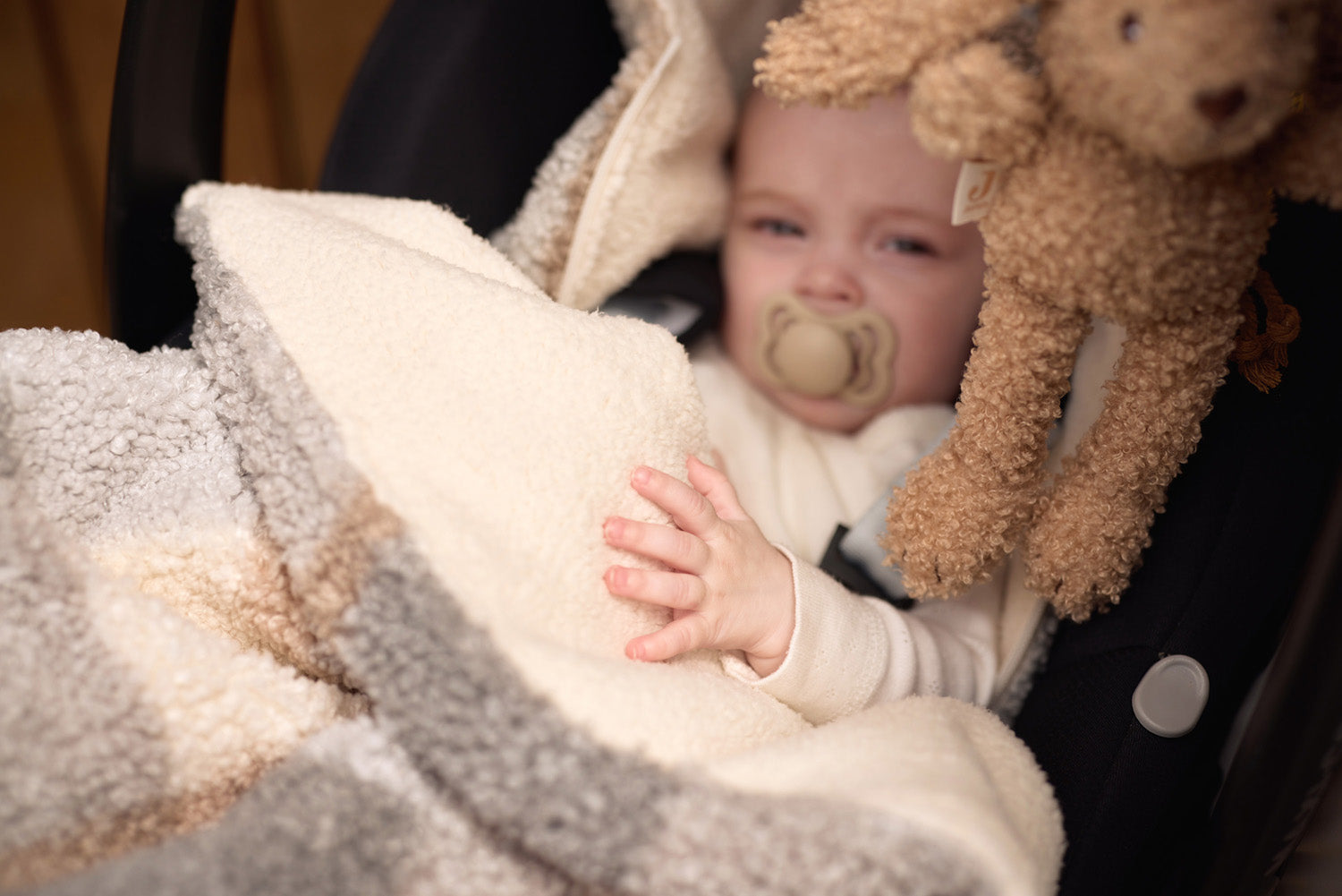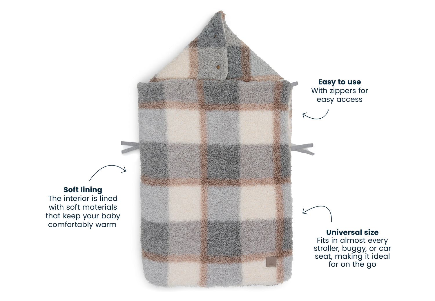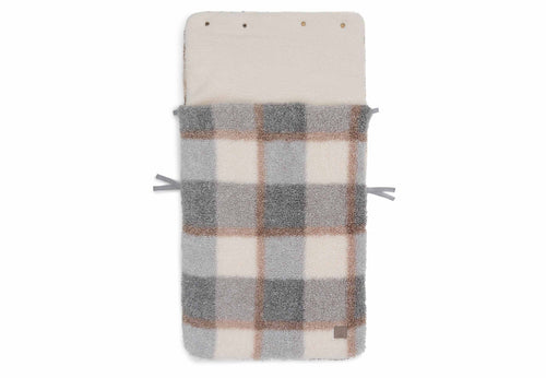 A footmuff is a true asset. You can easily place your baby in the footmuff by completely unzipping the bag first. You can also easily remove your baby from the car seat by unzipping the footmuff completely. In short: an incredibly practical comfort bag for your baby. The footmuff has openings in the back to make attaching belts very easy. It is a universal footmuff for the Maxi Cosi and any other brand of category 0 car seat with three or five-point harness. You can also use this comfort bag in the pram. So your baby will be wrapped up and warm for the walk in no time. The cooler Scandinavian colours of the Check Boucle print add a touch of sophistication to the overall look! A combination of the grey-blue colour and neutral tones creates an innovative look. This footmuff does not have a TOG rating, as it is designed to keep your little one warm on the go and not to be used as a sleeping bag.