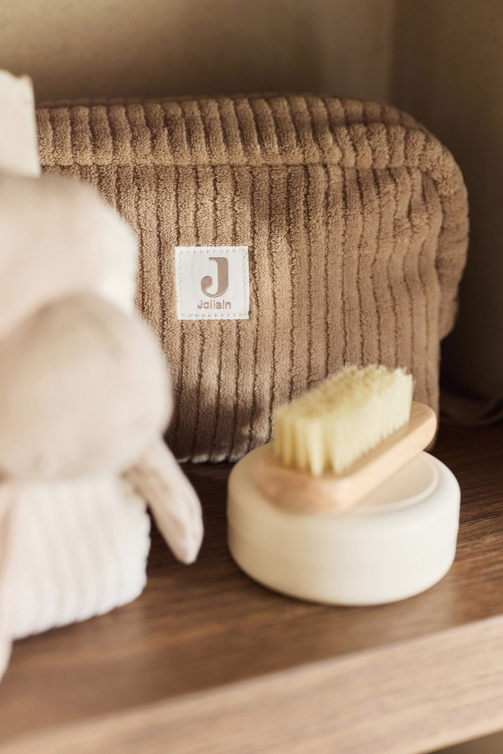 This pouch has a soft ribbed exterior and a lovely leaf print on the inside. Perfect for storing small items like baby care products. Practical, stylish, and a great addition to your baby essentials!