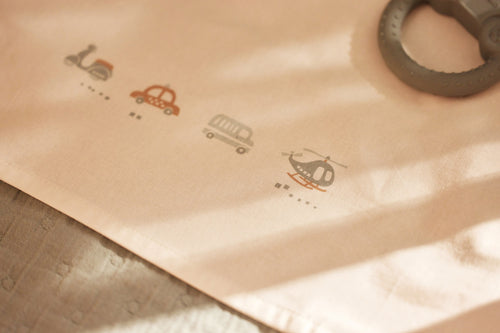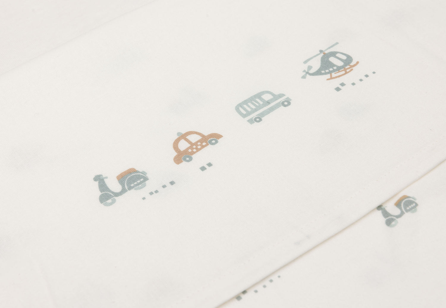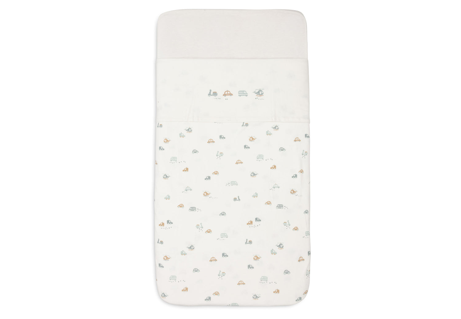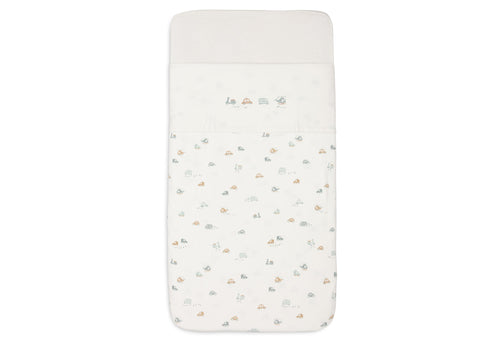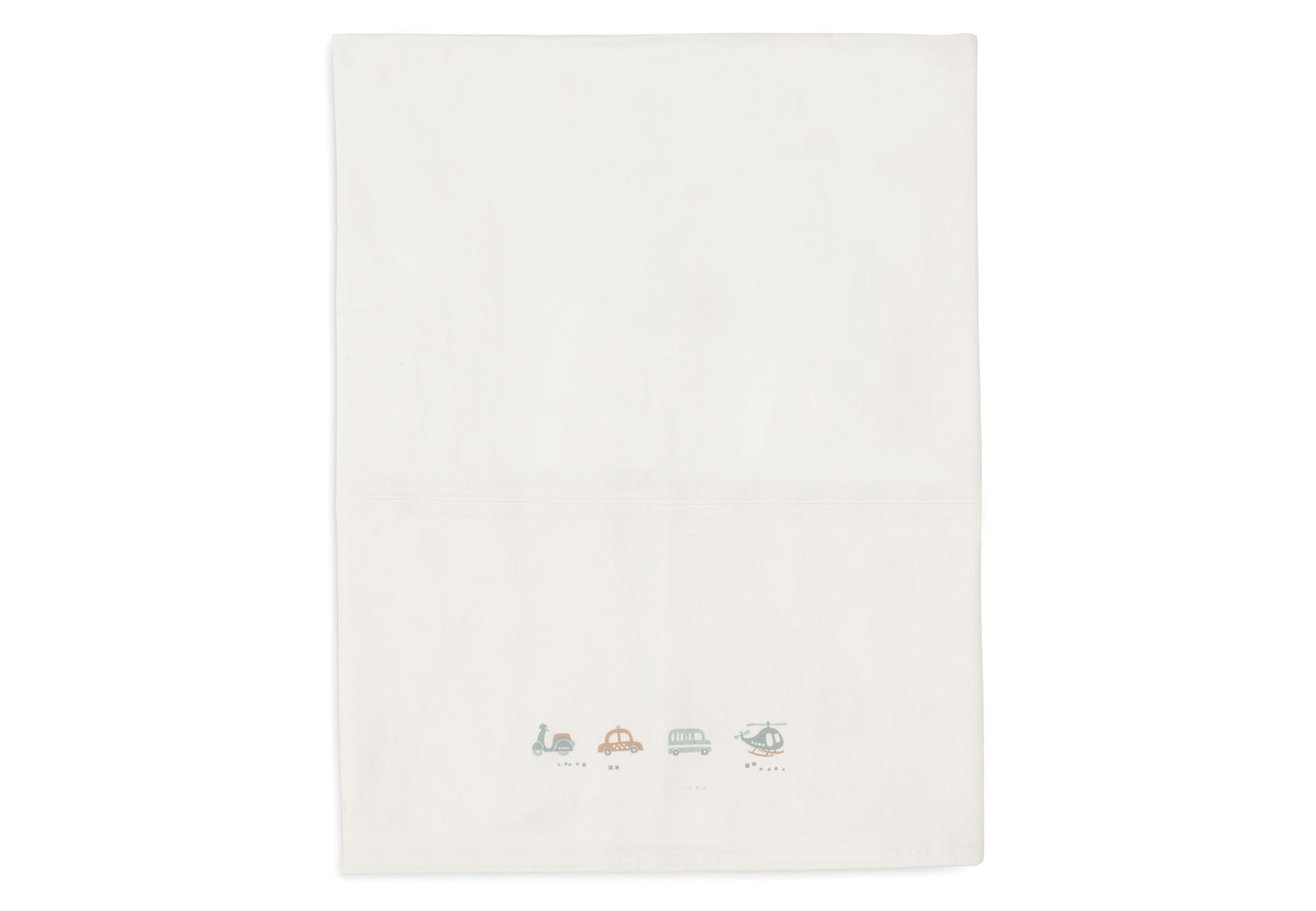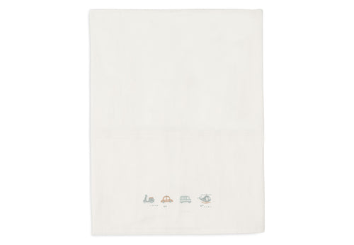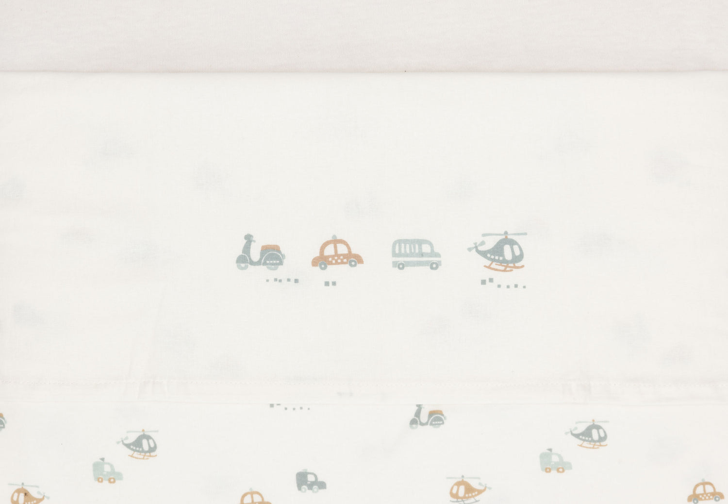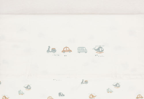 Let your little one dream under this beautiful bed sheet from the On The Go theme! This ivory-coloured sheet has a playful print with two cars, a scooter and a helicopter on the folded edge. This sheet is perfect to combine with blankets from the Cosy Knit collection and available in sizes for both cradle and cot.