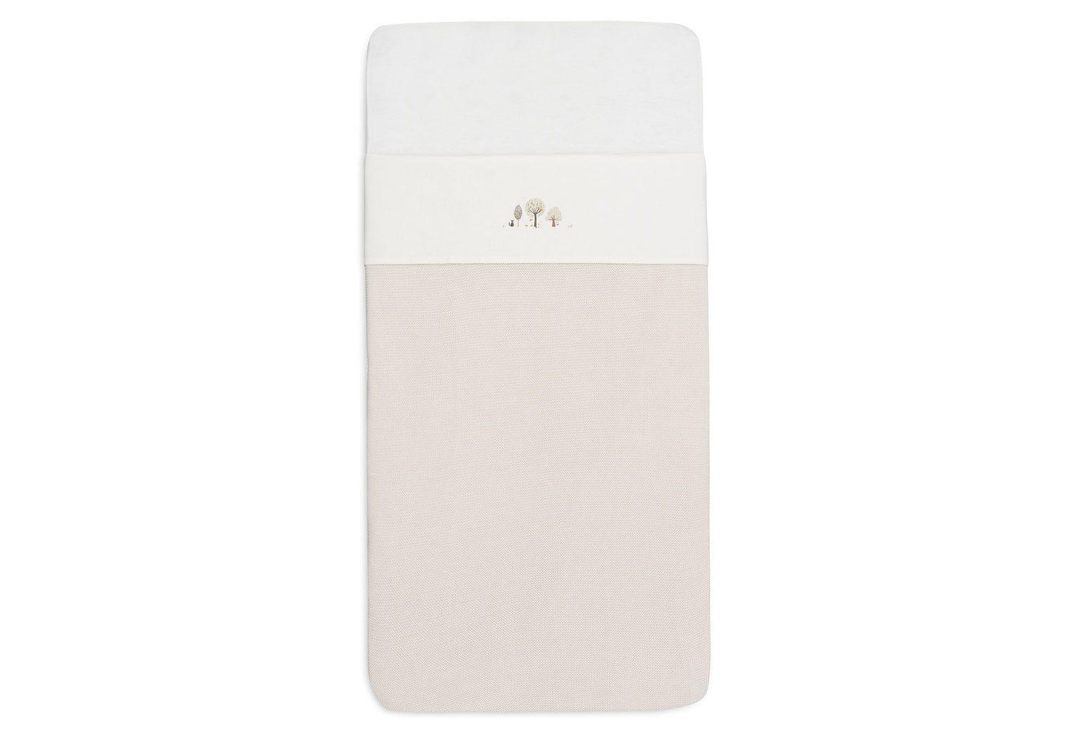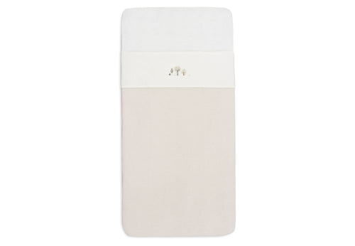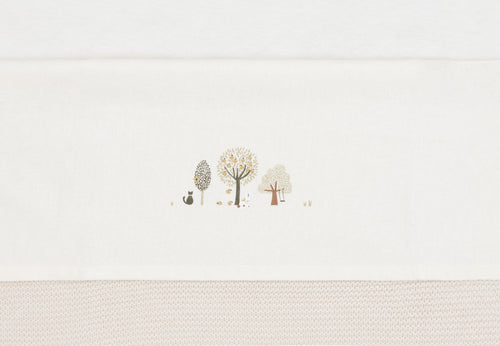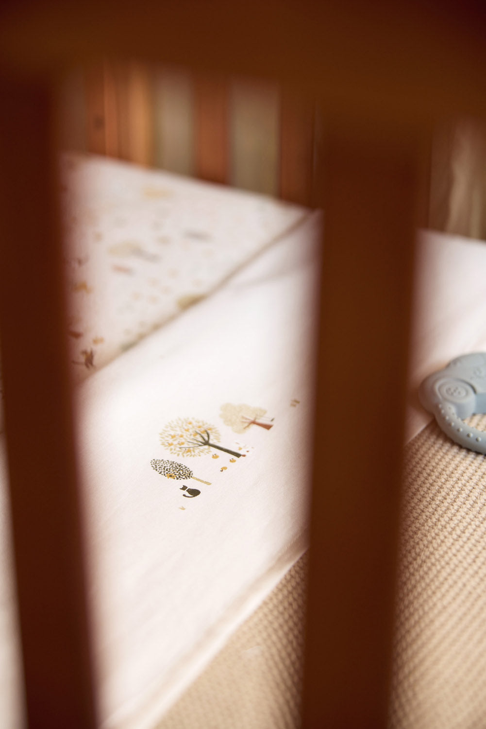 This sheet has a cute print of little trees and a kitten on an oatmeal background – perfectly matching the Tiny Park theme. It adds a playful and natural feel to the nursery. Pair it with a cozy oatmeal blanket to complete the crib.