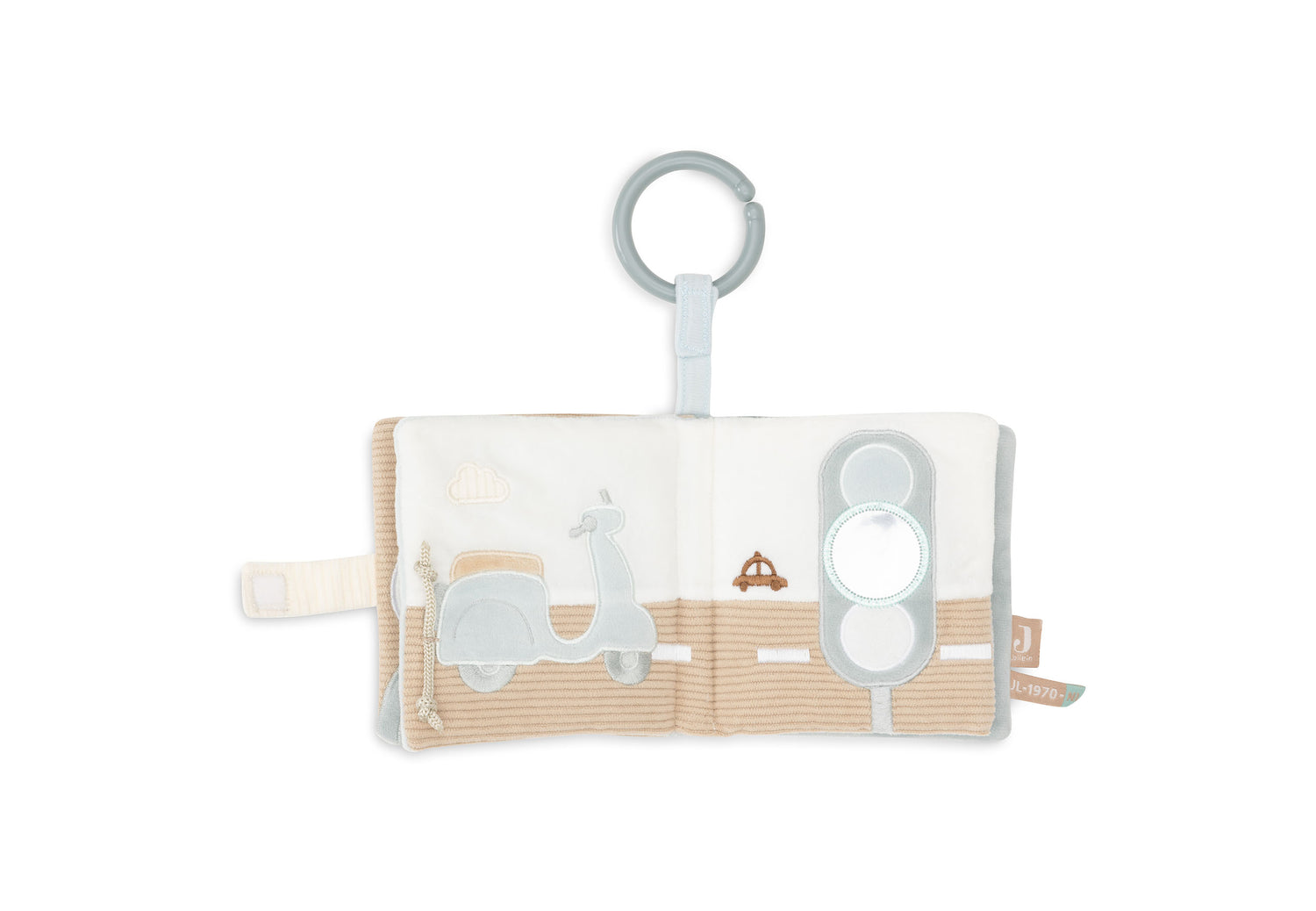 Explore the world with this unique activity book in the ‘On The Go’ theme! With four pages of super-soft ribbed fabric in Sea Green and Cloud Blue, this book is perfect for curious little hands. Each page is full of surprises: crinkles, playful strings and cute little mirrors in the shape of traffic lights. Attached to the book is a fun key with crackle sound for extra playtime fun. This activity book stimulates your little one's senses and provides endless entertainment, even On The Go!