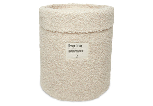 Practical basket made of soft pettable Bouclé fabric, perfect for storing loose items. The basket is 14 cm high, with a diameter of 18 cm. The front of the basket shows the fun 'bear-hug' logo. This basket is super practical to put on the changing table, to store little care items like a manicure set, a brush and a thermometer. And at the same time, it's a perfect item to add some atmosphere to the baby room. With this storage basket, you can keep the drawers of the dressing table tidy. A basket for socks, for care products and for baby slippers. It also looks very stylish on the dressing table! It's also very practical in the living room, for small toys. You can also combine this dressing table basket with the large storage basket Bouclé.