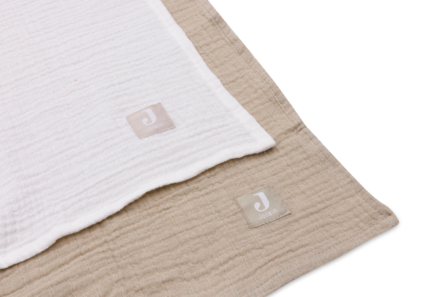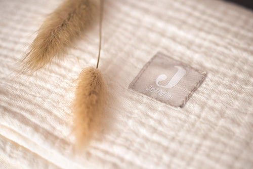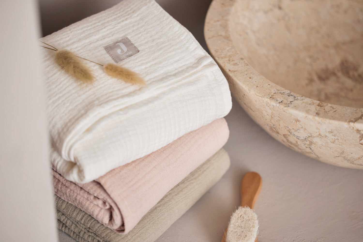 Our muslin cloths are perfect for the care of your baby and offer comfort and versatility in a practical set. The 'Small' version, with a practical size of 70x70 cm, comes in a practical 4-pack. These cloths are perfect for on the road, in the stroller or simply for daily use. The 'Large' version has a size of 115x115 cm and comes in a practical 2-pack. These bigger cloths are perfect to wrap your little one up in, to use as a spit cloth, or for other daily needs. This special set combines a harmonious colour combination of moonstone, wild rose and olive green, with calm ivory. This way, you are not just adding softness and versatility to the babyroom, but also creating a stylish and coherent look. Keep your little one comfortable and surrounded by softness with our muslin cloths.