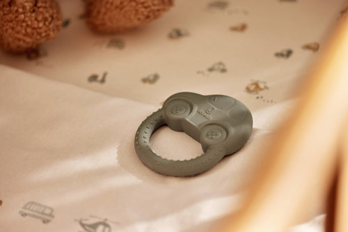 This cute car-shaped teething ring, with its ‘On The Go’ theme, is perfect for your little explorer who is teething! In a cheerful Sea Green colour, this teething ring is not only fun to look at, but also super easy to clean. It aids jaw development, relieves the pain of teething and offers a fun distraction. Choose rubber and let your little one explore safely!