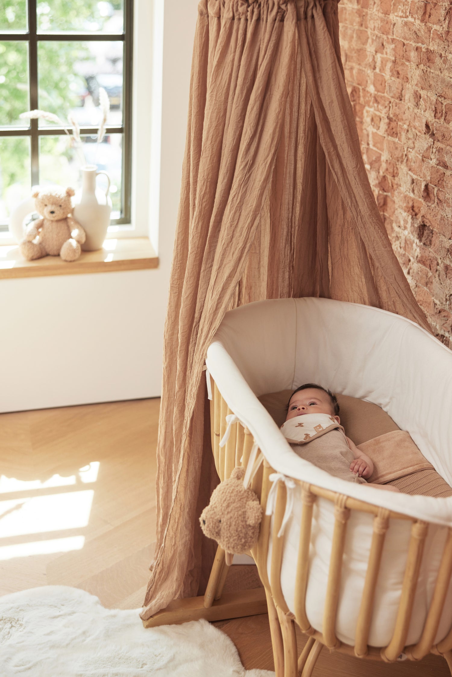 Yes, it’s part of the collection again: the vintage veil! A veil turns the cot into a cosy place to sleep. You’ll see: once the veil is up, it’s the finishing touch to the nursery. It provides atmosphere and security. With the matching peaked pole, you can hang a cot veil very easily without having to drill holes in the ceiling or wall. Will you choose this beautiful veil in the colour Wild Rose or Sea Green? Both colours match perfectly with the other items in our collection and bring atmosphere to every nursery.