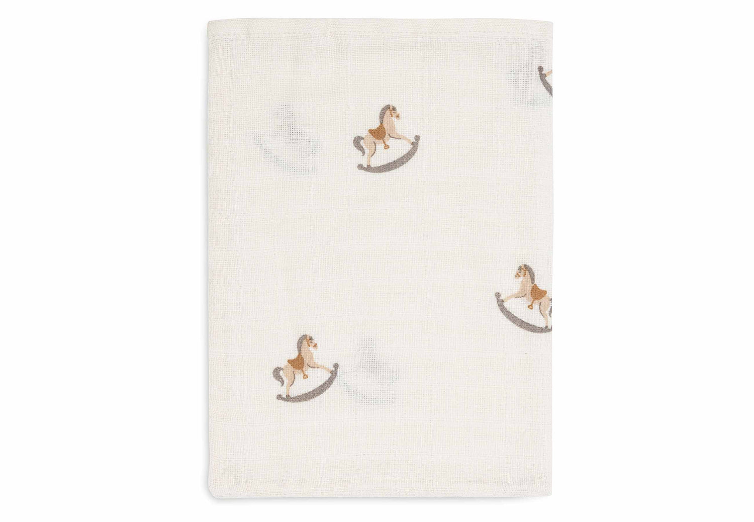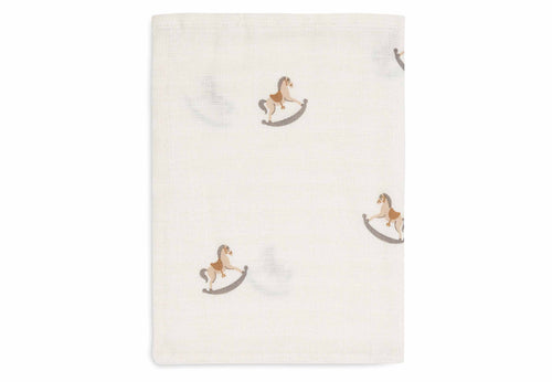 Muslin washcloths are useful when bathing your little baby. Also always useful for that quick morning wash on the changing mat. Your hand fits easily in the washcloth size and the muslin fabric is gentle on baby's delicate skin. The thin, smooth fabric makes it easy to reach the skin folds or under the chin without damaging the skin. Also useful on the go for cleaning dirty mouths and dirty hands. Just how cute is the Nostalgic Ride print with rocking horses? These washcloths come in a 3-pack, so you always have plenty of them!