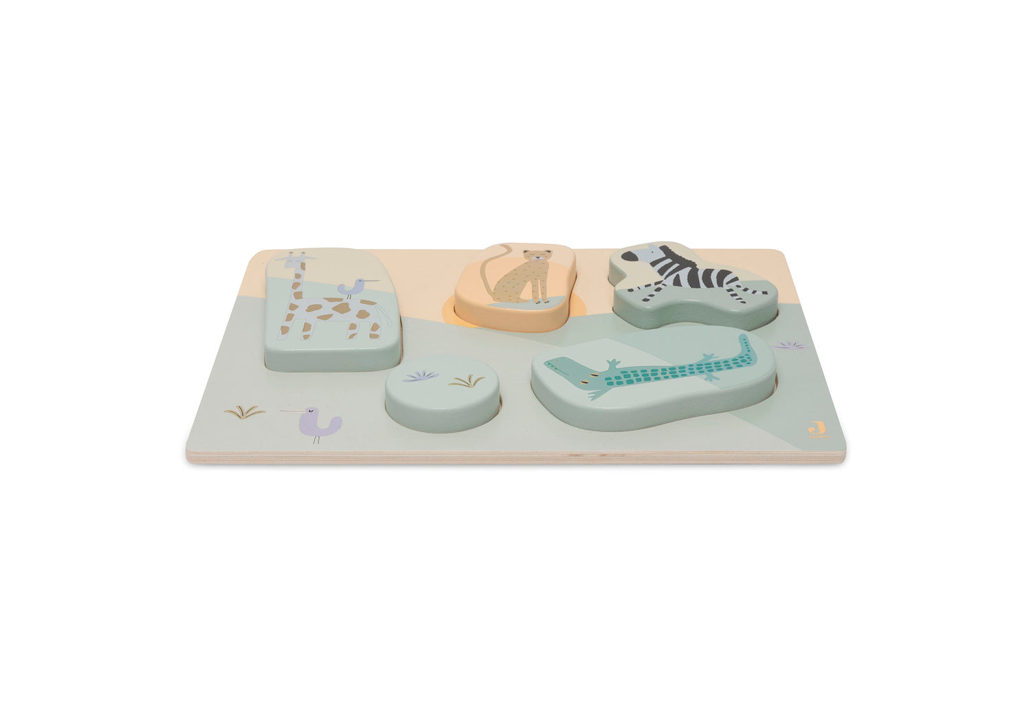 Let your little one bring all the jungle animals together in this fun wooden puzzle and enjoy hours of fun. This puzzle is also easy for little ones to assemble due to the thickness of the puzzle pieces. This puzzle contains a total of 5 puzzle pieces and all the wood in the puzzle is 100% FSC certified, which makes this a sustainable option! Let’s start with the puzzle.