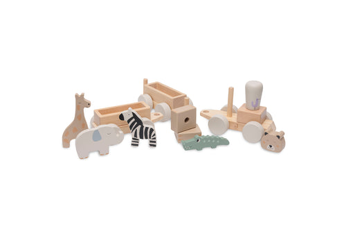 A wooden toy train is a true classic. There's nothing more fun than loading up wagons and driving the train around. Wheels, steering and brakes are a big learning process for your little one. This jungle-themed train comes with all kinds of animals that like to be transported: a crocodile, giraffe, elephant, zebra and a cheetah form the audience. Surely this will allow your little one to entertain himself for hours.