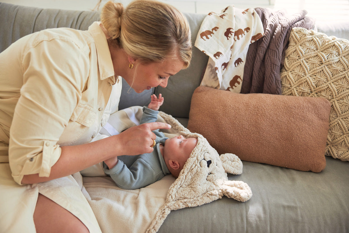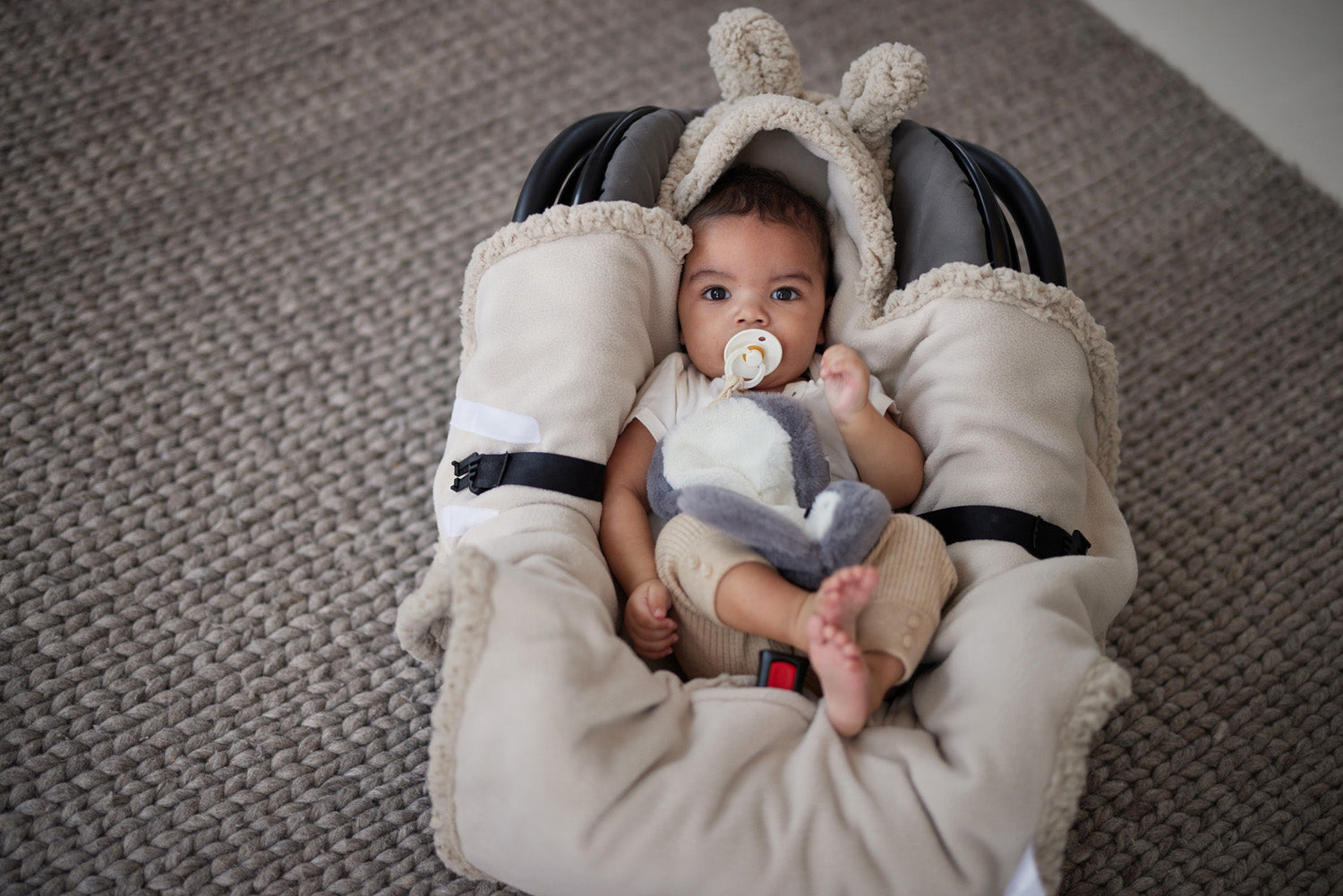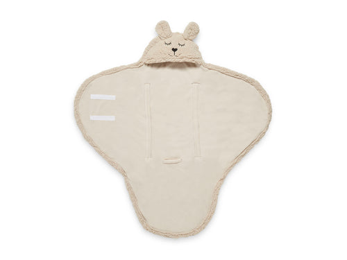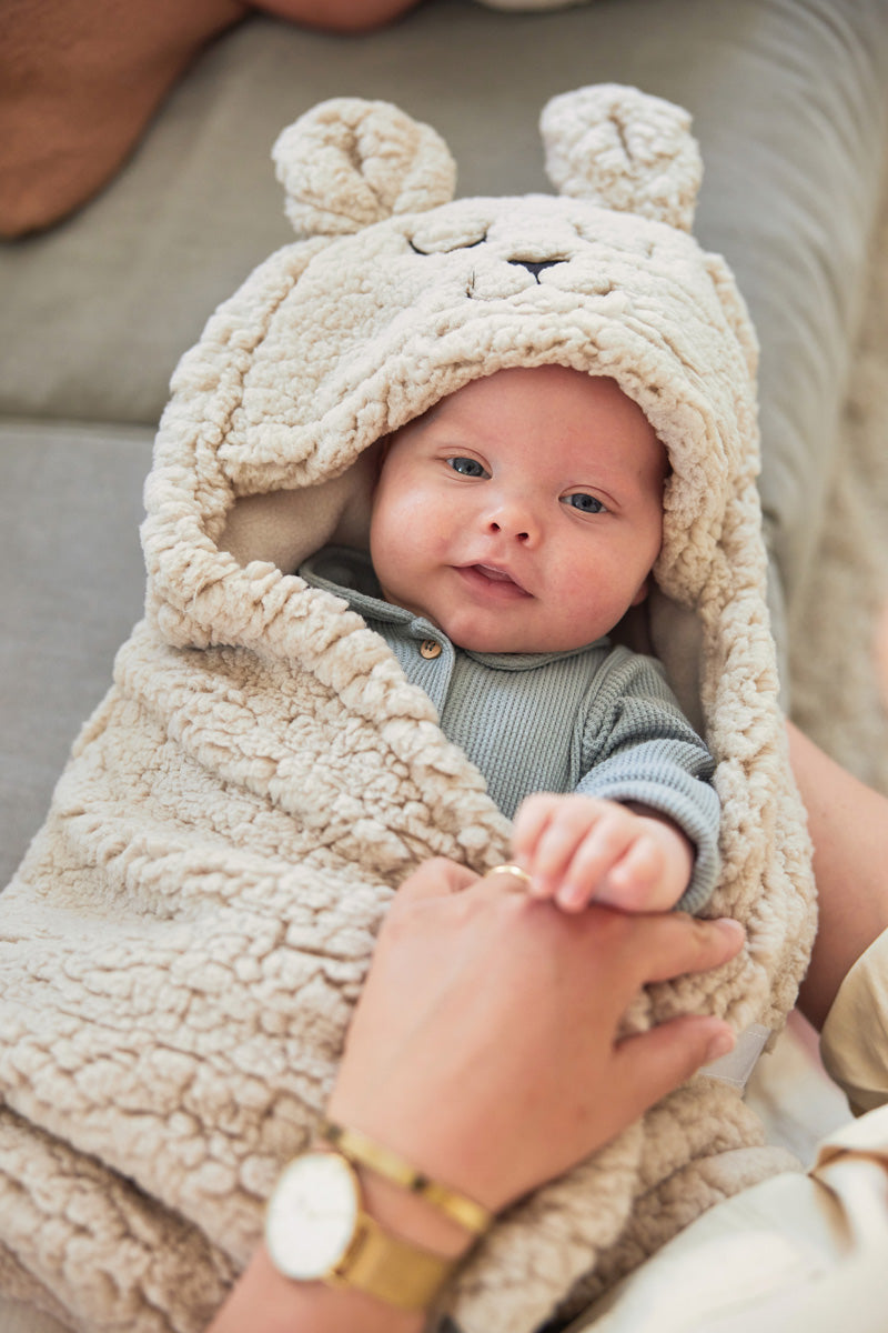 Wrap blanket with guaranteed mega high cuteness factor. The fabric has a fluffy fur look on the outside and wonderfully comfortable softness on the inside. Wrap your baby in this wrap and close the blanket with the practical Velcro strips. Put on the hat to go with it and look, those cute little ears and ditto bunny face on the hat. So, so cute! This wrap can be used from birth. And also very practical to use in baby's first car seat. Will you choose the colour Wild Rose or Sea Green?