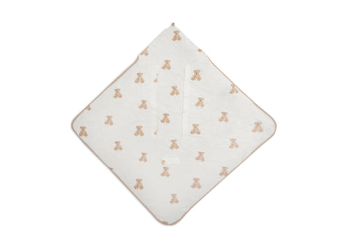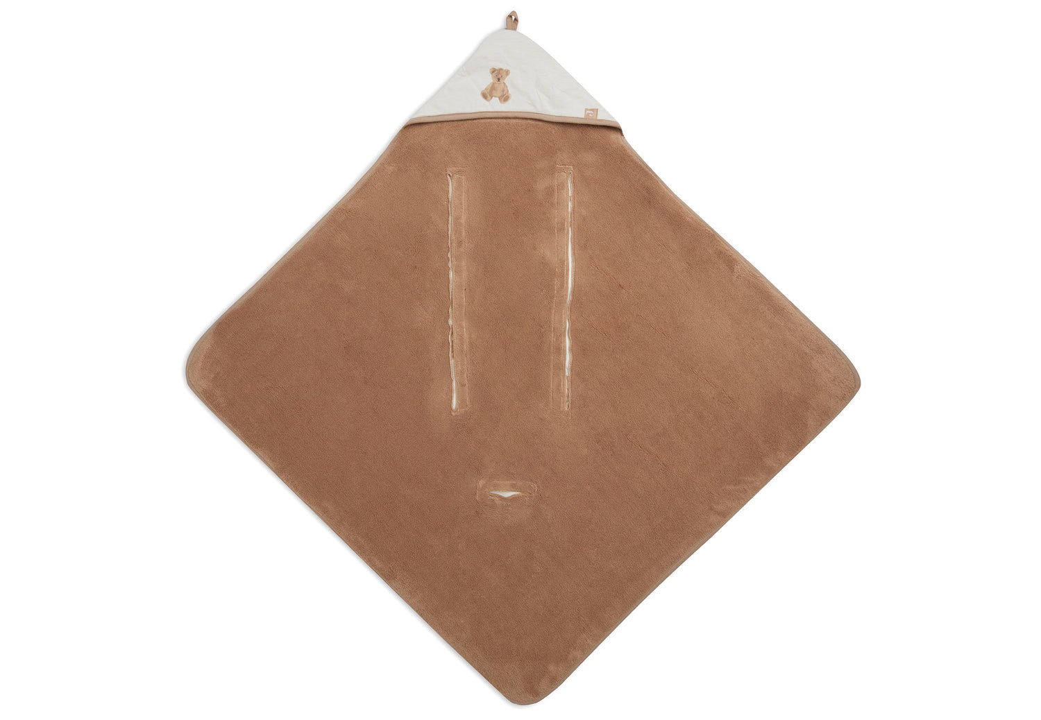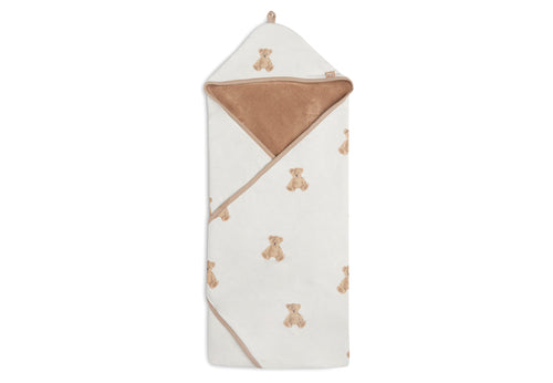 Wrap blanket with guaranteed mega cuteness factor. It has fluffy fur-look fabric on the outside, and it's super comfortably soft on the inside. Wrap your baby up and close the blanket with the practical velcro strips. Put the little hat on, with adorable little ears and a little bear face. Too cute! This wrap blanket can be used from birth. And it's also practical to use in your baby's first car seat. You can put the belts of the car seat through the openings in the blanket, so your baby can stay in their wrap. It's a universal wrap blanket for the Maxi Cosi and every other brand of category 0 cat seat with three or five point seatbelts. Available in various colours.